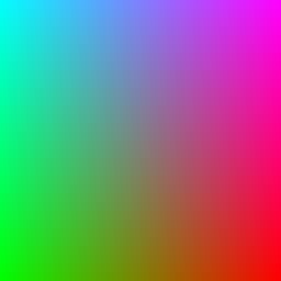Combinando de forma aditiva estas tres imágenes, en cada una de las cuales uno de los tres colores principales (rojo, verde y azul) varía de forma continua entre 0 y 255, se obtiene la siguiente composición de colores (Imagen 1):