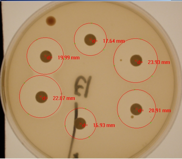 La figura siguiente muestra la imagen (gentileza de BBraun) de una cápsula con 6 discos y sus correspondientes halos de actividad. Con la función del programa MIP para medir el diámetro de un círculo, a partir de tres puntos marcados sobre el mismo, se han obtenido los valores precisos del tamaño de dichos halos. Las medidas repetitivas sobre un mismo círculo permite obtener un valor medio de su diámetro y superficie.