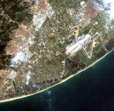 Conjunto de dos imágenes del aeropuerto de Barcelona, captadas por el sensor ETM del satélite LANDAST 5. En la imagen de la izquierda se visualizan los tres canales visibles del sensor (azul, verde y rojo) por lo que la composición puede considerarse que corresponde al color real, después de restar una gran parte del efecto de difusión atmosférica. En la imagen de la derecha se combinan los canales rojo, infrarrojo próximo e infrarrojo medio del sensor a los que se les atribuye las componentes de color azul, verde y rojo respectivamente. Esta imagen debe considerarse como un falso color, ya que combina canales visibles y canales no visibles al ojo humano. |