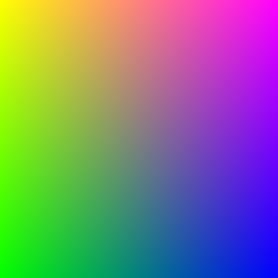 Combinando de forma aditiva estas tres imágenes, en cada una de las cuales uno de los tres colores principales (rojo, verde y azul) varía de forma continua entre 0 y 255, se obtiene la siguiente composición de colores (Imagen 1):