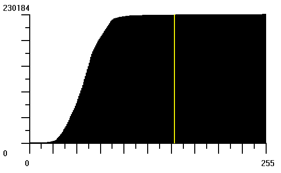 Aspecto de los histogramas acumulativos, de la componente intensidad del color, de la imagen antes y después de la linearización o ecualización de los mismos. En la imagen linearizada, el histograma acumulativo se convierte prácticamente en una función rectilínea. Sin embargo, el histograma de la imagen original muestra que, la mayor parte de la información se acumula en un corto intervalo de niveles de gris (aprox. entre los valores 25 y 75). |