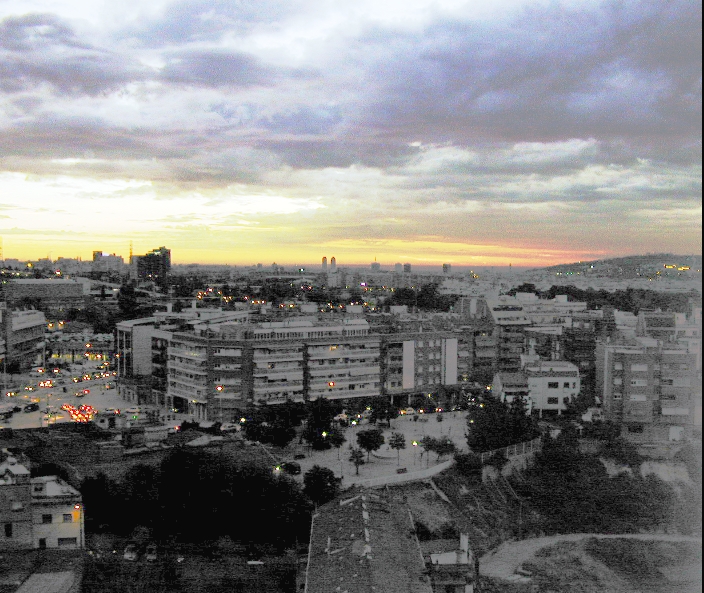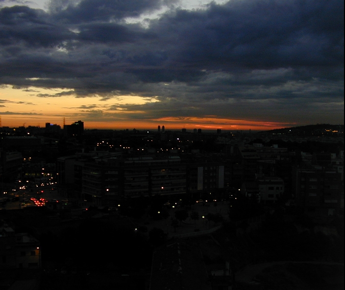 Fotografía de Barcelona al amanecer, en la que el primer término resulta mal iluminado y prácticamente invisible. Cámara Nikon CoolPix 950. Imagen reducida a la mitad. |