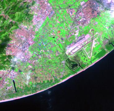 Conjunto de dos imágenes del aeropuerto de Barcelona, captadas por el sensor ETM del satélite LANDAST 5. En la imagen de la izquierda se visualizan los tres canales visibles del sensor (azul, verde y rojo) por lo que la composición puede considerarse que corresponde al color real, después de restar una gran parte del efecto de difusión atmosférica. En la imagen de la derecha se combinan los canales rojo, infrarrojo próximo e infrarrojo medio del sensor a los que se les atribuye las componentes de color azul, verde y rojo respectivamente. Esta imagen debe considerarse como un falso color, ya que combina canales visibles y canales no visibles al ojo humano. |